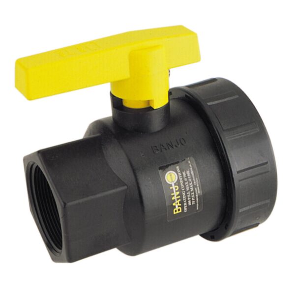 BANJO UV125FP 1 1/4 inch SINGLE UNION POLY BALL VALVE precision molded in glass reinforced polypropylene, for strength and chemical resistance while also being lightweight and easy to handle. Interlocking body and end plate to allow easy thread connection when installing valves. EPDM O-rings to handle most fertilizers and many chemicals.