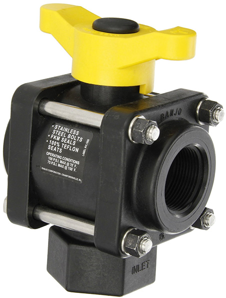 Banjo V125BL 1 1/4″ 3-Way Bottom Load Poly Valve. BOTTOM LOAD: Directional flow, right or left. Valve can be turned off to stop flow.