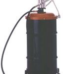 Lincoln Air Operated Grease Pump for 120lb.drum – Stationary unit with 50:1 ratio pump – Includes air coupler,nipple,7 ft. material delivery hose,universal swivel,air motor muffler,& control valve – Drum cover is rust-proof & finished in red baked enamel.