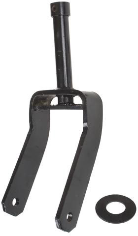 Fork assembly for tailwheel, shaft on yoke is 1-1/2″ diameter, 8″ overall length, 7-1/4″ to pin hole, space between forks is 6″, 3/4″ axle holes.