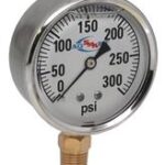 Gauges filled with liquid provide effective dampening of most pulsation and vibration and provide lubrication of all moving parts. These gauges require no dampening device. 2-1/2″ diameter case, 1/4″ MPT brass inlet.