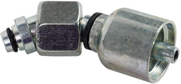 Parker 43-series hydraulic fitting, Female Metric S – Swivel – 45 degree Elbow, Tube size: 8mm, Thread size: M16 x 1.5, Hose ID: 1/4″, (A)Overall length: 2.32″ (59mm), (W)Hex size: 19mm, (B)Cutoff allowance: 1.38″ (35mm)