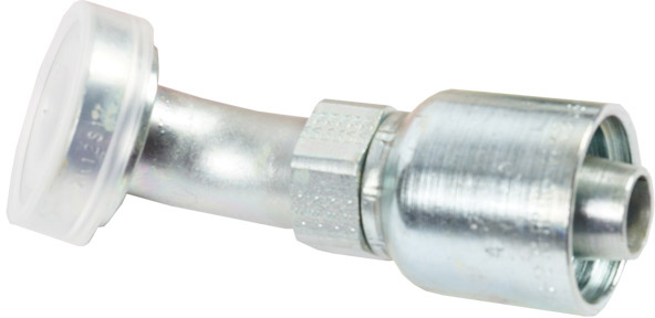 Parker 43-series hydraulic fitting, SAE Code 61 Flanged-head, 45 degree Elbow, (ISO 12151-3-E45S-L), Tube side: 1″, Hose ID: 3/4″, (A)Overall length: 3.85″ (98mm), (B)Cutoff allowance: 2.41″ (61mm), (F)Diameter: 1-3/4″